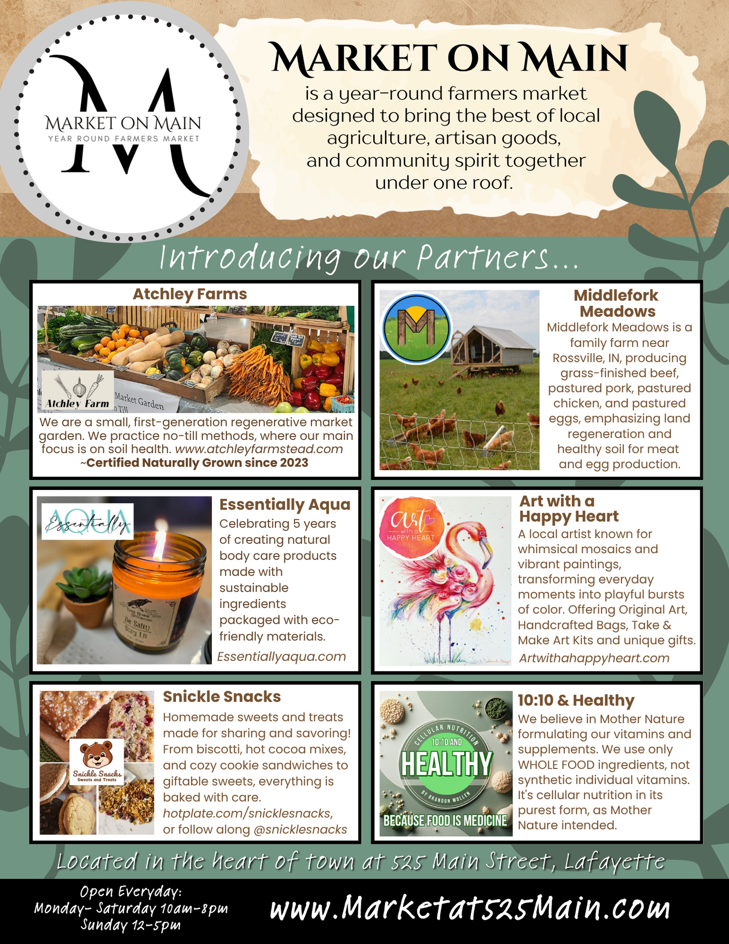 Market on Main is a year-round farmers market designed to bring the best of local agriculture, artisan goods, and community spirit together under one roof. Located in the heart of town @ 525 Main Street, Lafayette.