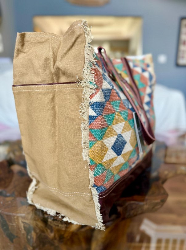 *Gorgeous geometric pattern on front in teal, yellow, orange and blue hues