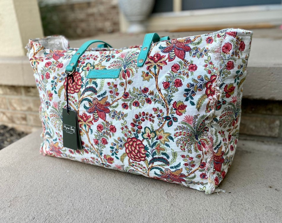Gorgeous blossoms and foliage, the hallmark of our Mariposa series, grace this stunning bag. All the beautiful tones of red, orange, teal and gold are accented perfectly leather trim and carrying handles in bright turquoise leather. Frayed edge treatments finish out the design with a flourish. The back has an extra zippered pocket for convenience. A magnificent bag in all aspects!