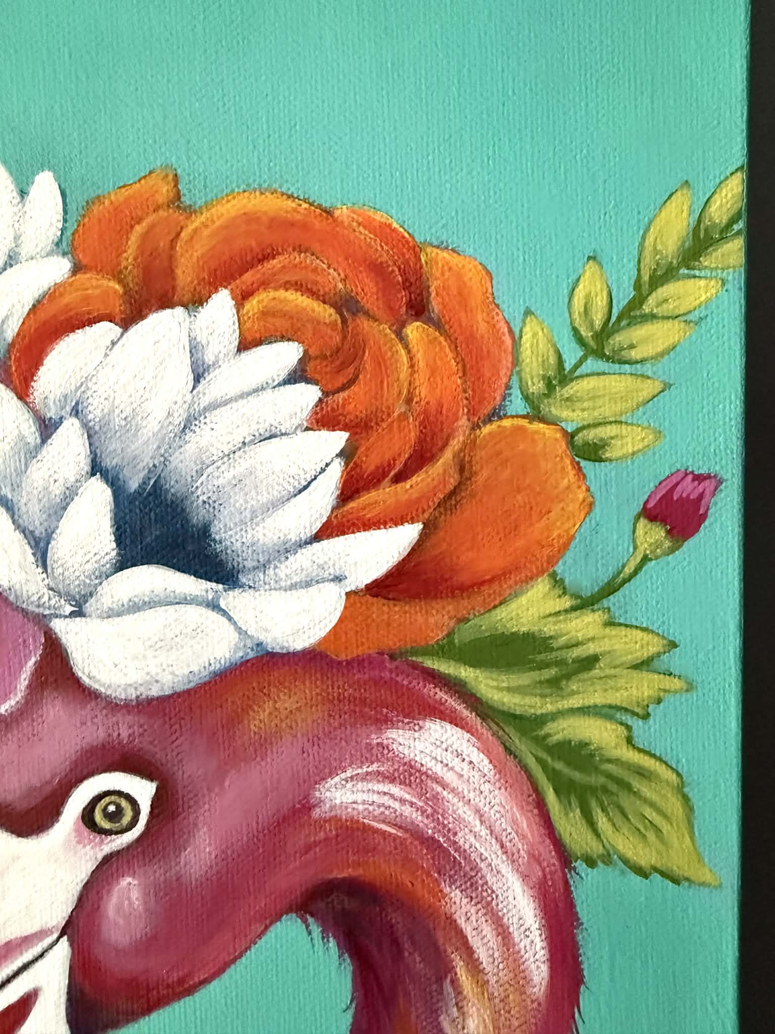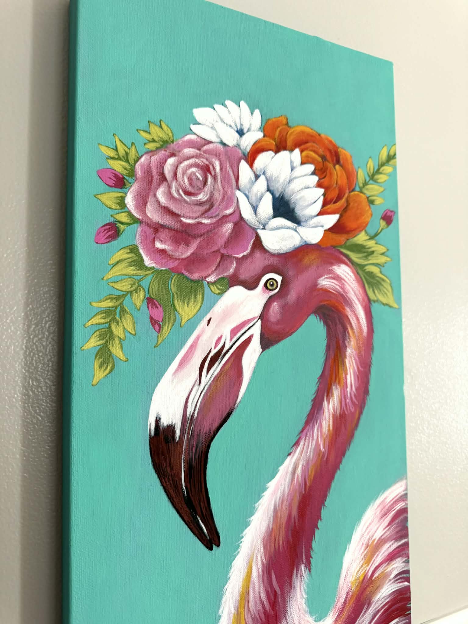 A whimsical flamingo in vibrant pink against a blue/green background, wearing a flower crown in bright, fresh colors. The style is playful and contemporary, cuz art should make you happy :)
